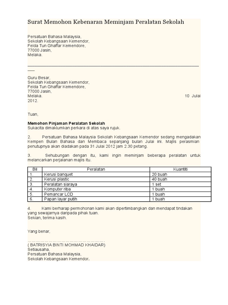 Surat Memohon Kebenaran Meminjam Peralatan Sekolah Pdf